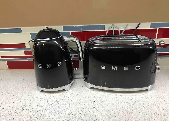 Das Apartment hat ein Badezimmer mit einer getrennten Toilette, einer Badewanne und einer Dusche sowie eine komplette Küche mit einem Wasserkocher, einem Kühlschrank und einem Herd.